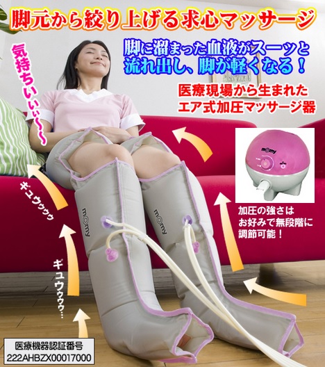 エアマッサージャーモミーと類似するマッサージ機は他にもいろいろあるけど、家庭用だと効果に?がついて気休め程度にしかならないけど、エアマッサージャーモミーは、医療機器から生まれだけあって本当に力も強くて、効果的にマッサージしてくれます。